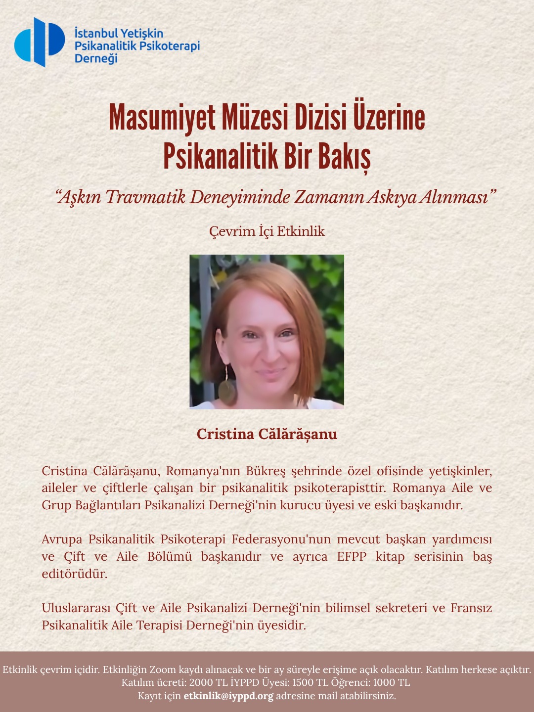 Etkinliğimiz EFPP Başkan Yardımcısı Psikanalitik Psikoterapist Cristina Călărăşanu’nun tartışması ve formasyon üyelerimizden F. Senem Şahlar’ın moderasyonu eşliğinde gerçekleşecektir.